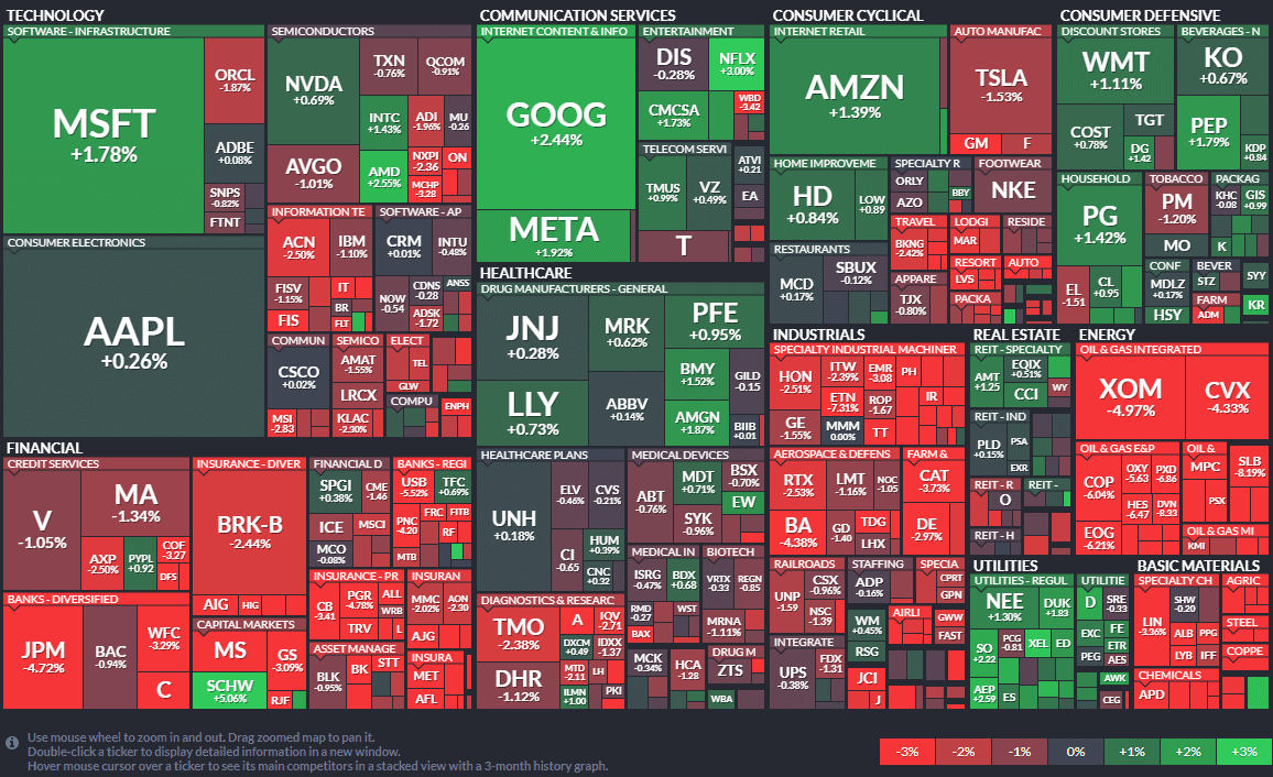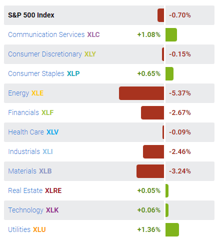 에너지와 유틸리티, 금융 섹터가 크게 하락했고 그나마 테크와 커뮤니케이션 그리고 필수소비재가 상승했습니다.